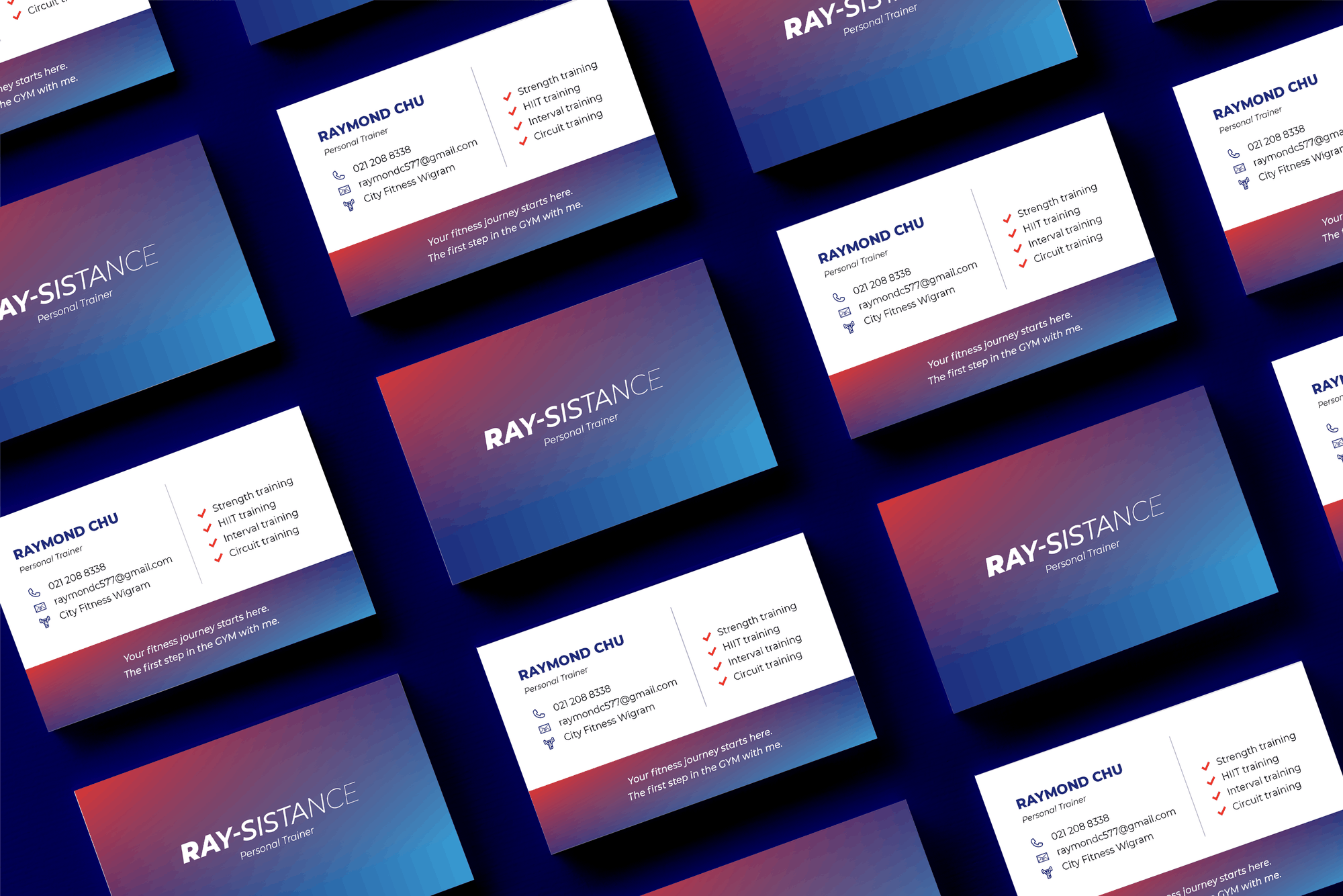 Welcome to the world of personalised fitness journeys! In this portfolio project, Business cards tailored specifically for Raymond Chu, a personal at City Fitness. Each card encapsulates the essence of the unique personality, blending professionalism with a touch of personal flair. From vibrant colors that radiate energy to sleek typography that exudes expertise, these business cards are more than just contact information – they're a reflection of your dedication to helping clients achieve their fitness goals. Let your business cards speak volumes about your commitment to health and wellness, leaving a lasting impression on potential clients at every handshake.